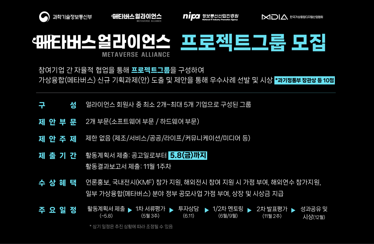 ㅇ 신청자격 : 메타버스 얼라이언스 회원사 중 최소 2개 이상의 기업으로 구성된 프로젝트 그룹