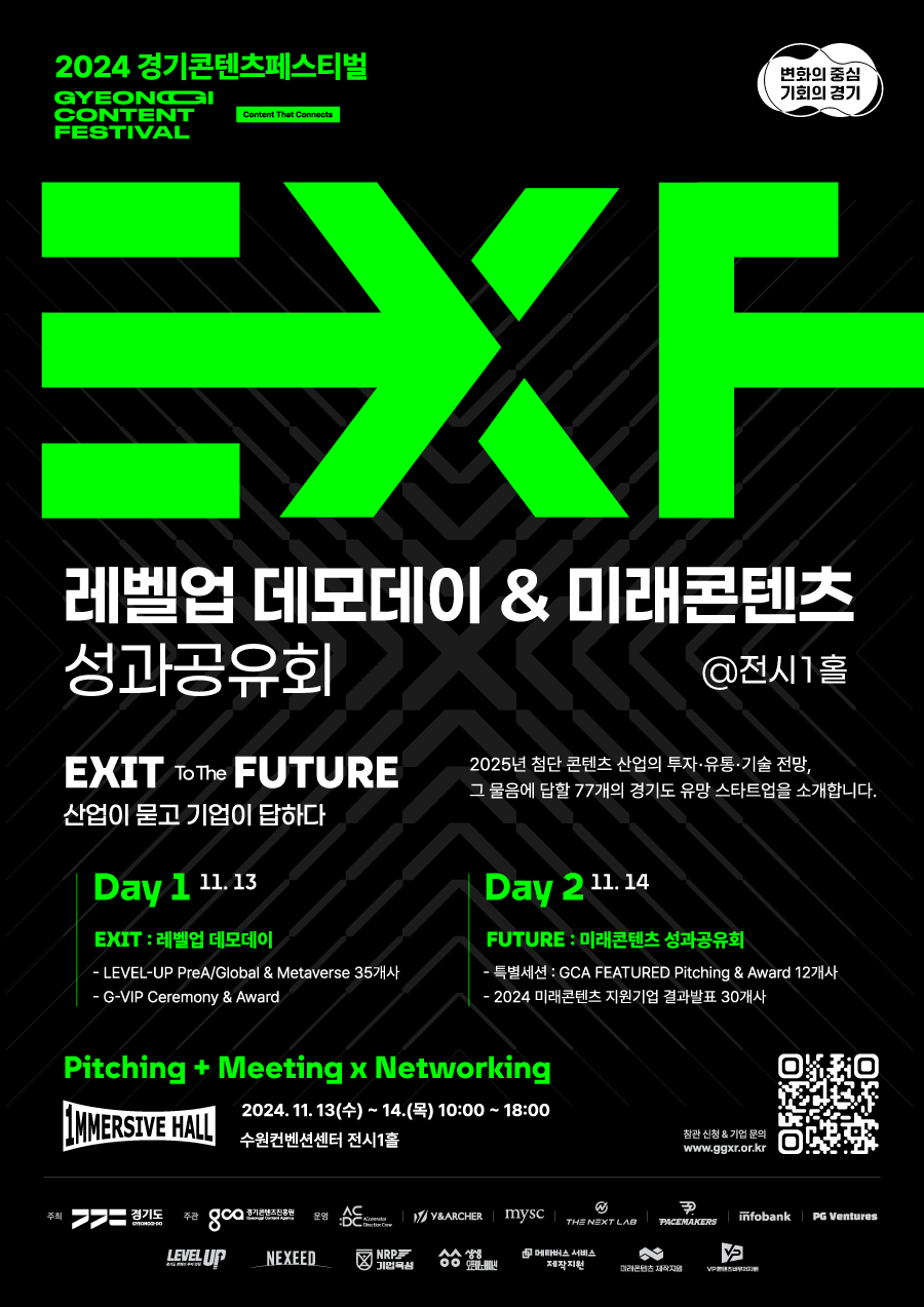 - 주요 프로그램 : 경기도 유망 콘텐츠 스타트업 77개사의 피칭 발표 & B2B 비즈미팅, 네트워킹, 콘텐츠 표출 등