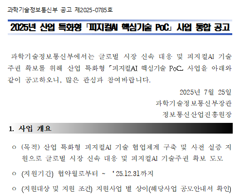 1. [공고문] 2025년 산업 특화형 피지컬AI 핵심기술 PoC 사업 통합 공고.hwp