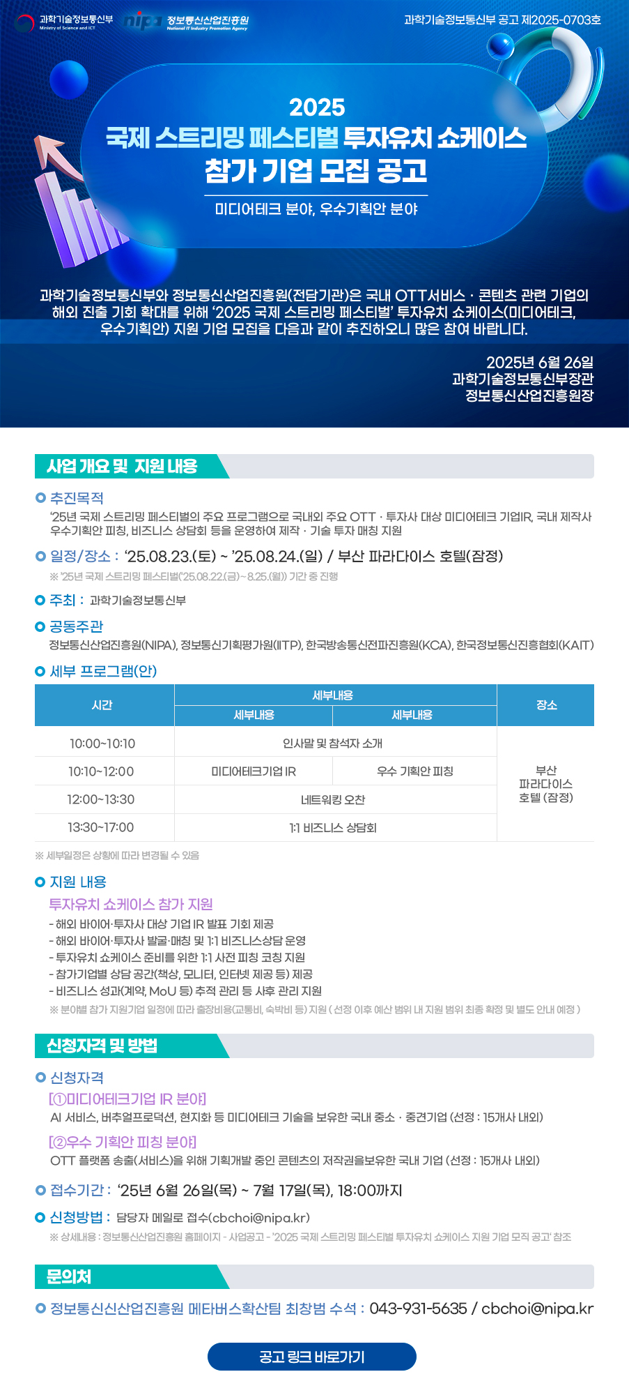 [정보통신산업진흥원] 2025 국제 스트리밍 페스티벌 투자유치 쇼케이스 참가 기업 모집 공고