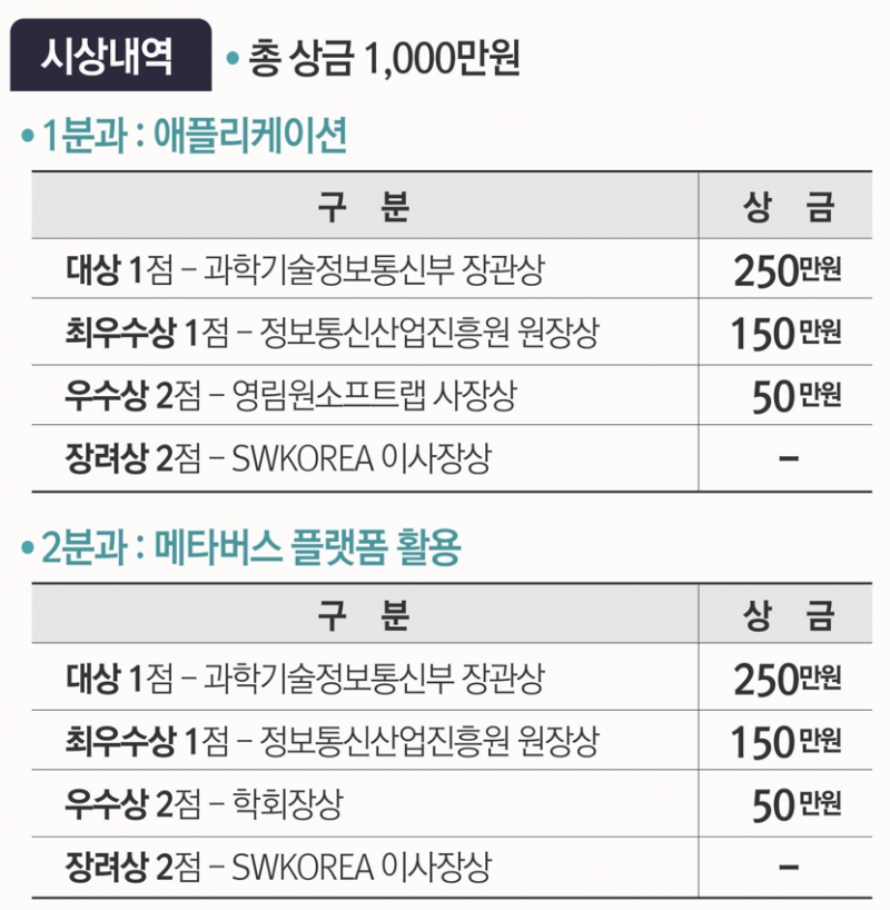 - 지원 사항 및 시상 일정은 수행 및 협력 기관 사정에 의해 변경될 수 있음