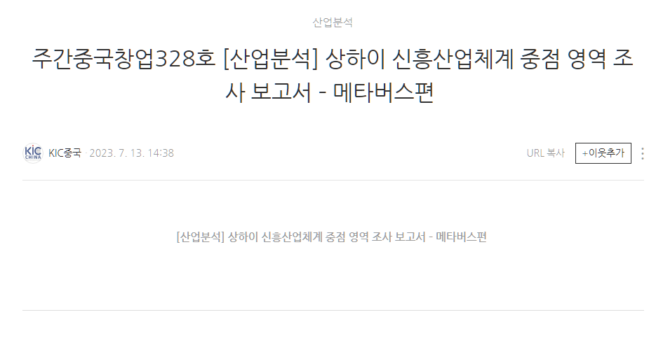 [글로벌혁신센터]주간중국창업328호[산업분석]상하이 신흥산업체계 중점 영역 조사보고서-메타버스편