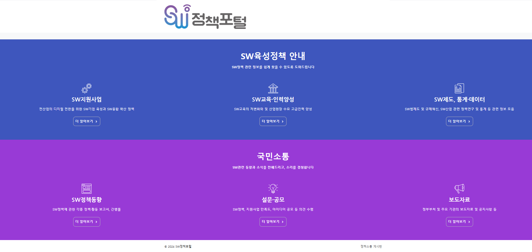 이 포털은 SW지원사업, SW교육/인력양성사업, SW제도/통계·데이터 등 소프트웨어 육성정책을 조회하실 수 있습니다.