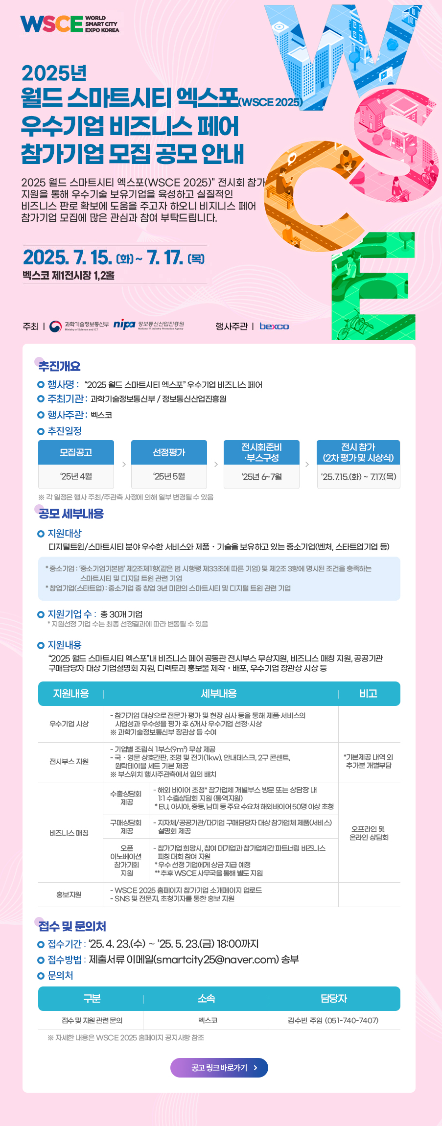 [정보통신산업진흥원] 2025년도 월드 스마트시티 엑스포 우수기업 비즈니스 페어 참가기업 모집 공고 안내
