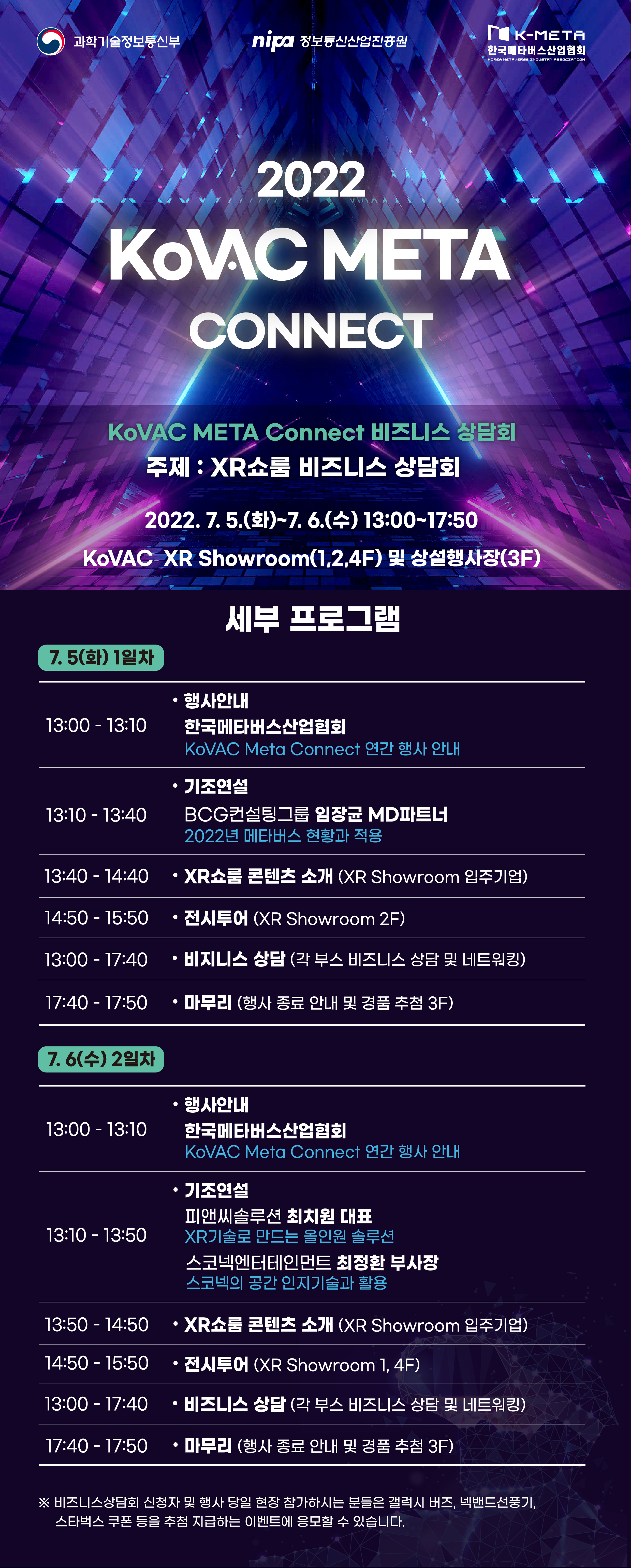 과학기술정보통신부와 정보통신산업진흥원이 주최하고 한국메타버스산업협회가 주관하는<2022 KoVAC META Connect 비즈니스상담회>가 오는 7월 5일(화) ~ 7월 6일(수)에 2일간 개최됩니다.