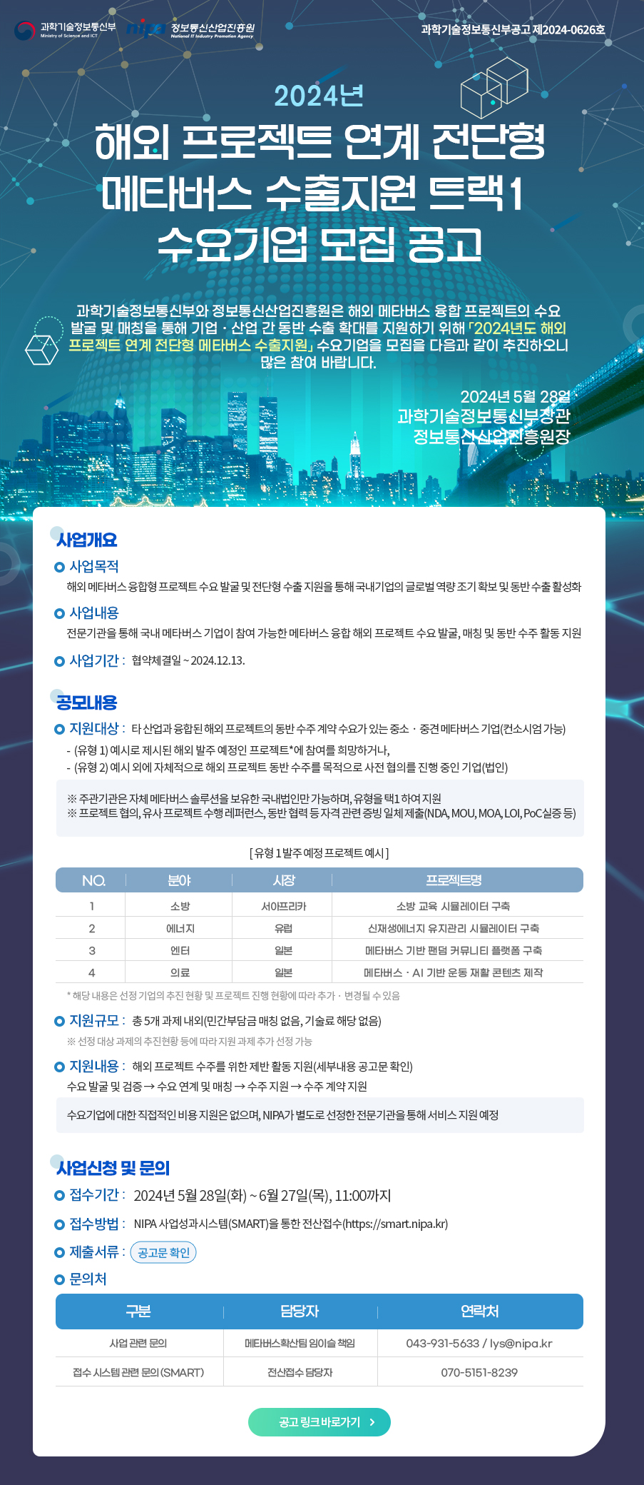 1. [공고문] 2024년「해외 프로젝트 연계 전단형 메타버스 수출지원」 트랙1 수요기업 공모(수정).pdf 2. [양식] 제출서류.zip 3. [매뉴얼] 접수 매뉴얼 및 관련 규정.zip