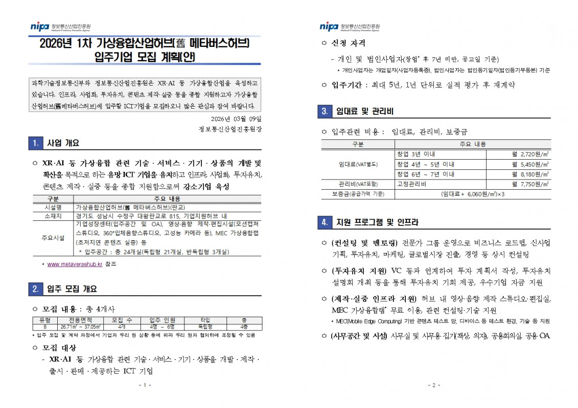 [NIPA] 2026년 1차 가상융합산업허브(메타버스허브) 입주기업 모집(~4/8, 15:00)