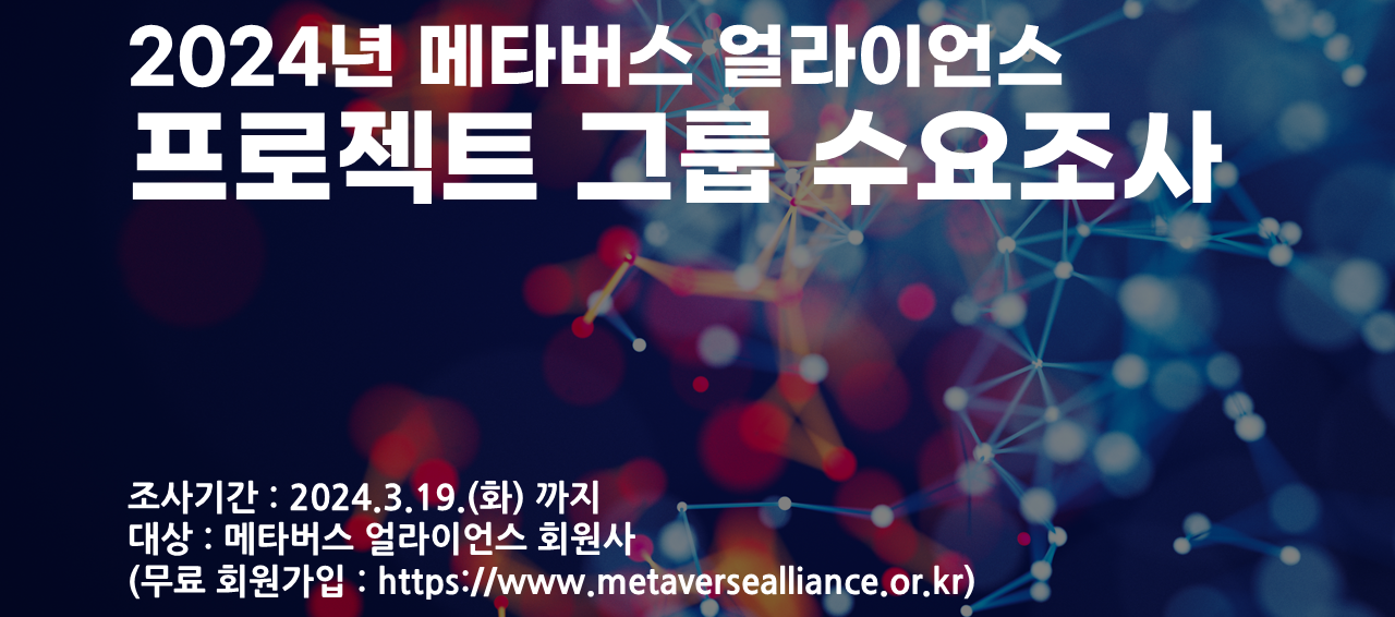 현재 "24년 메타버스 얼라이언스 프로젝트 그룹 모집"이 5월 24일까지 진행되고 있습니다.