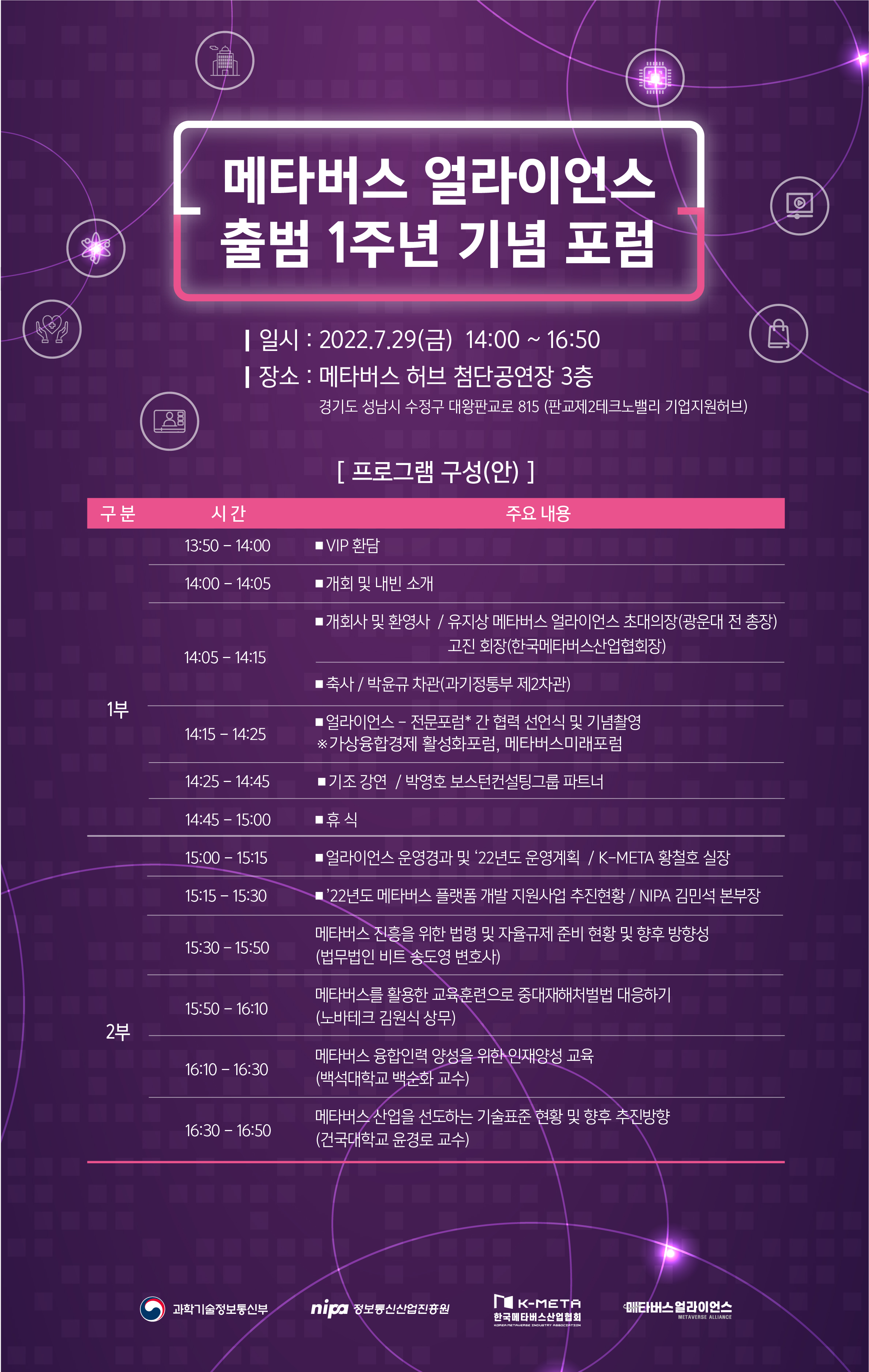 "메타버스 출범 1주년 기념 포럼'을 2022년 7월 29일(금), 오후 2시에 개최합니다.