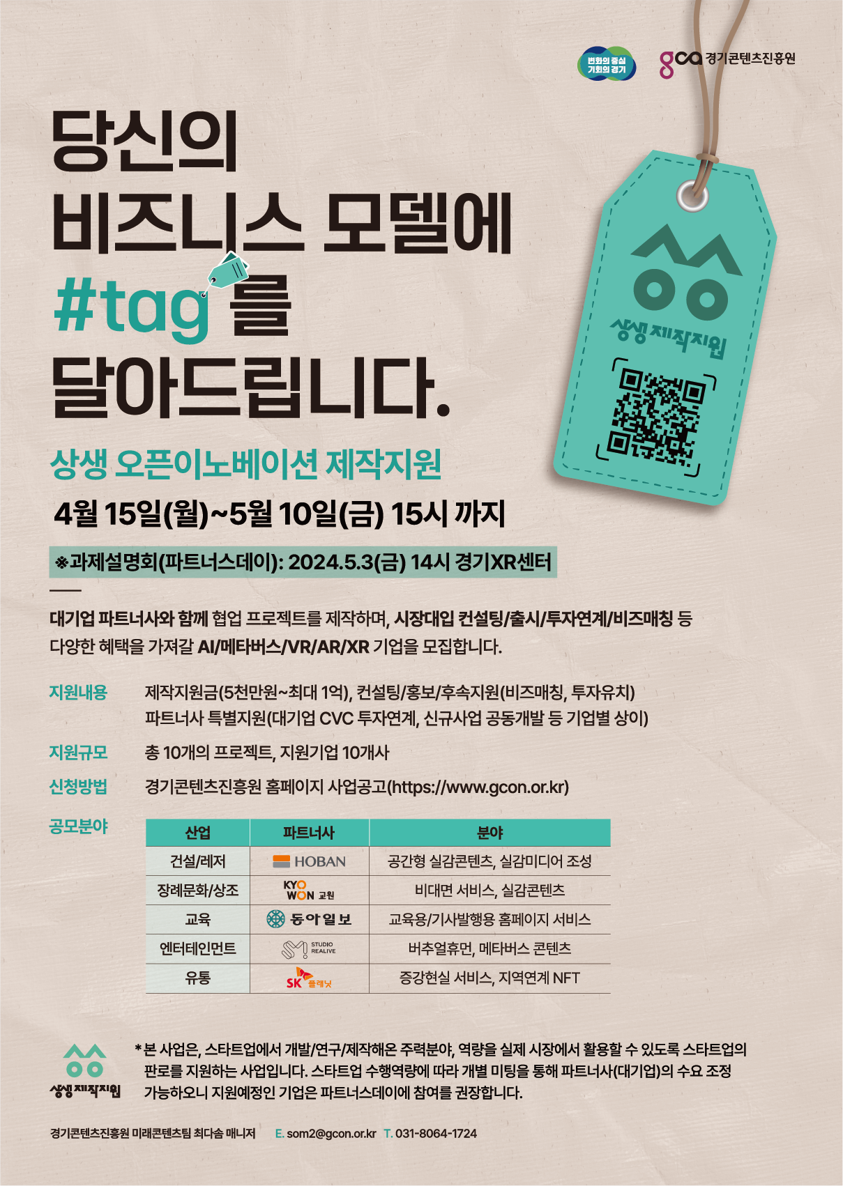 사업공고 링크 : 2024 상생 오픈이노베이션 제작지원 참여기업 모집(과제설명회 5.3) < 사업공고 < 알림마당 < 경기콘텐츠진흥원 (gcon.or.kr) 과제설명회 링크 : 상생 오픈이노베이션 과제설명회 신청 (google.com)