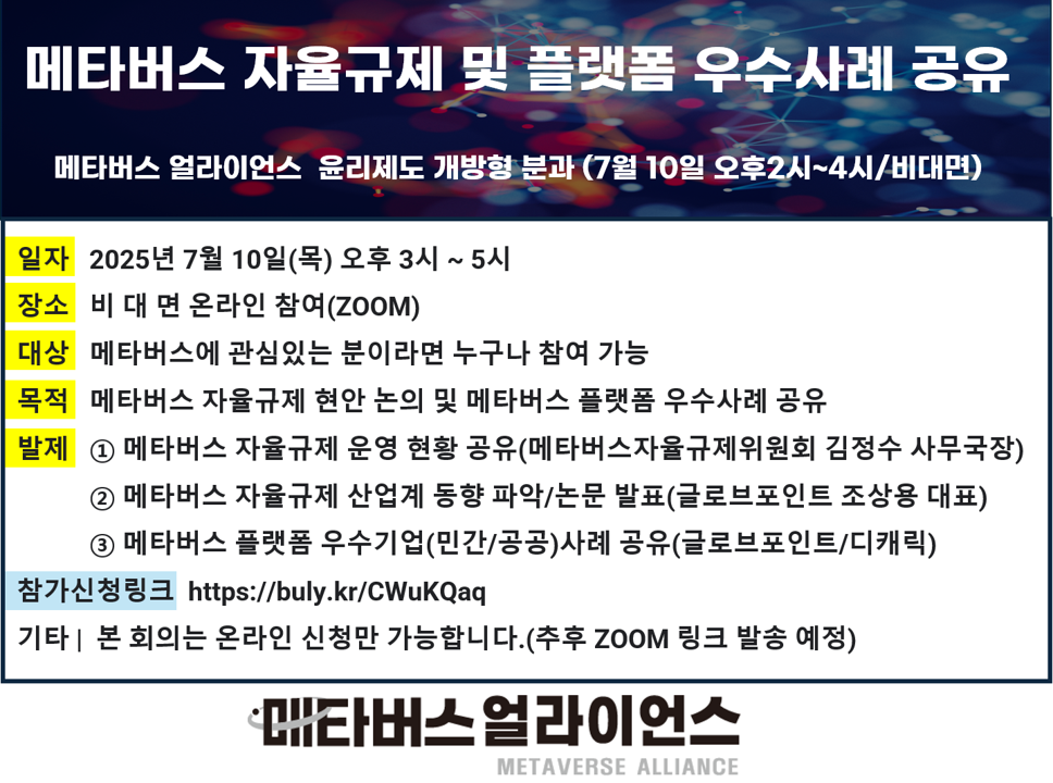 ※ 문의: 메타버스 얼라이언스 사무국 이혜민 과장(070-8765-8316/minn219@k-meta.or.kr)