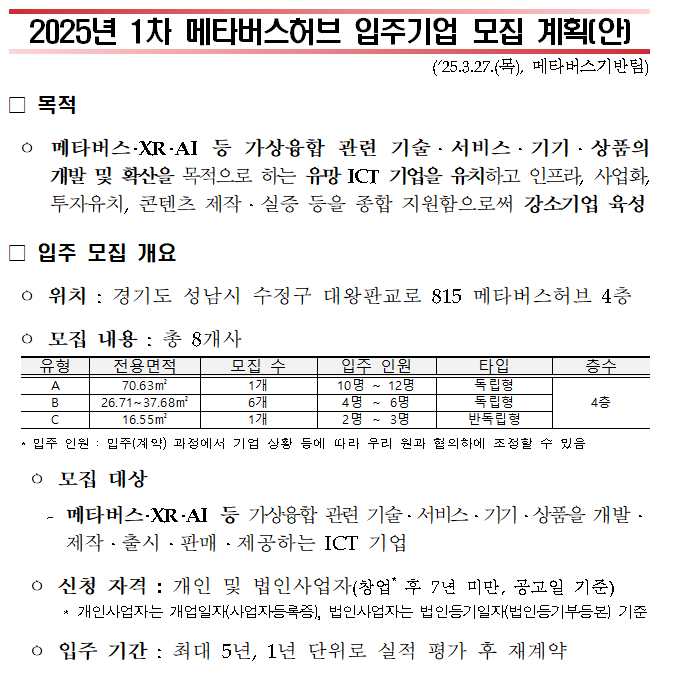 [정보통신산업진흥원] 2025년 1차 메타버스 허브 입주기업 모집 안내