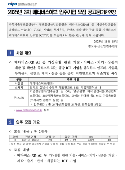 [정보통신산업진흥원] 2025년 3차 메타버스 허브 입주기업 모집 안내(기한연장)