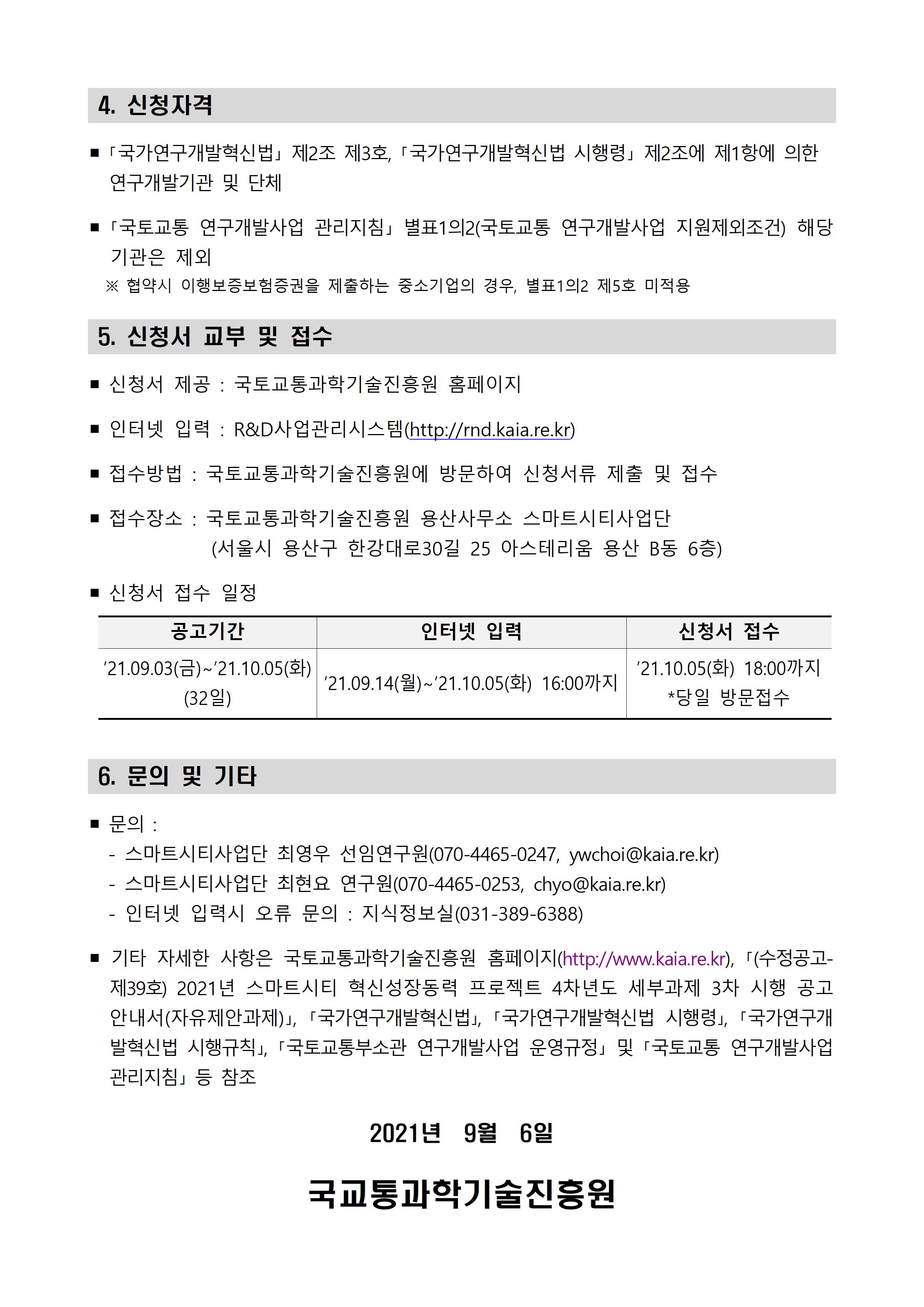 [국교통과학기술진흥원] 2021년 스마트시티 혁신성장동력프로젝트 4차년도 세부과제 3차 시행 공고(자유제안과제)