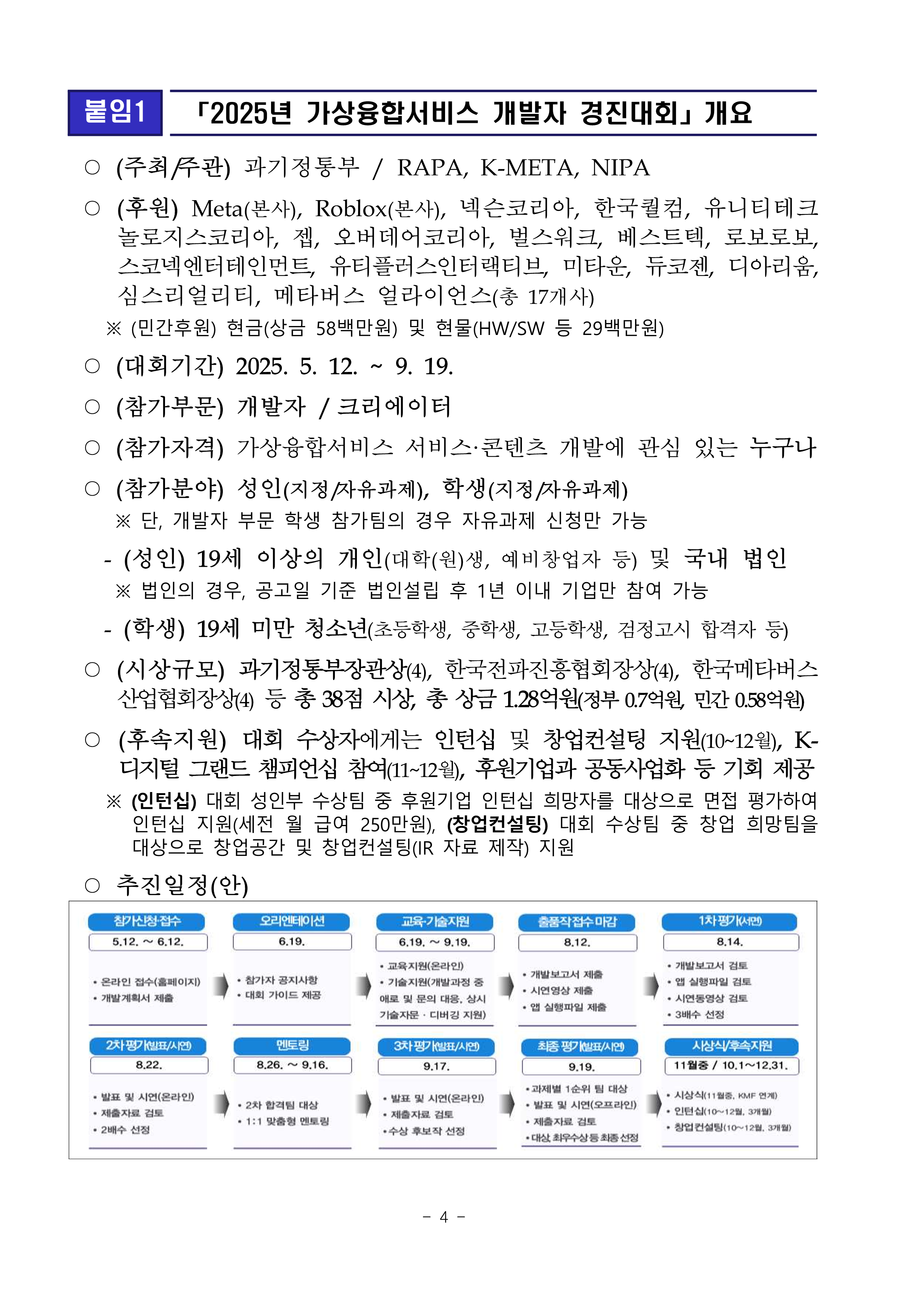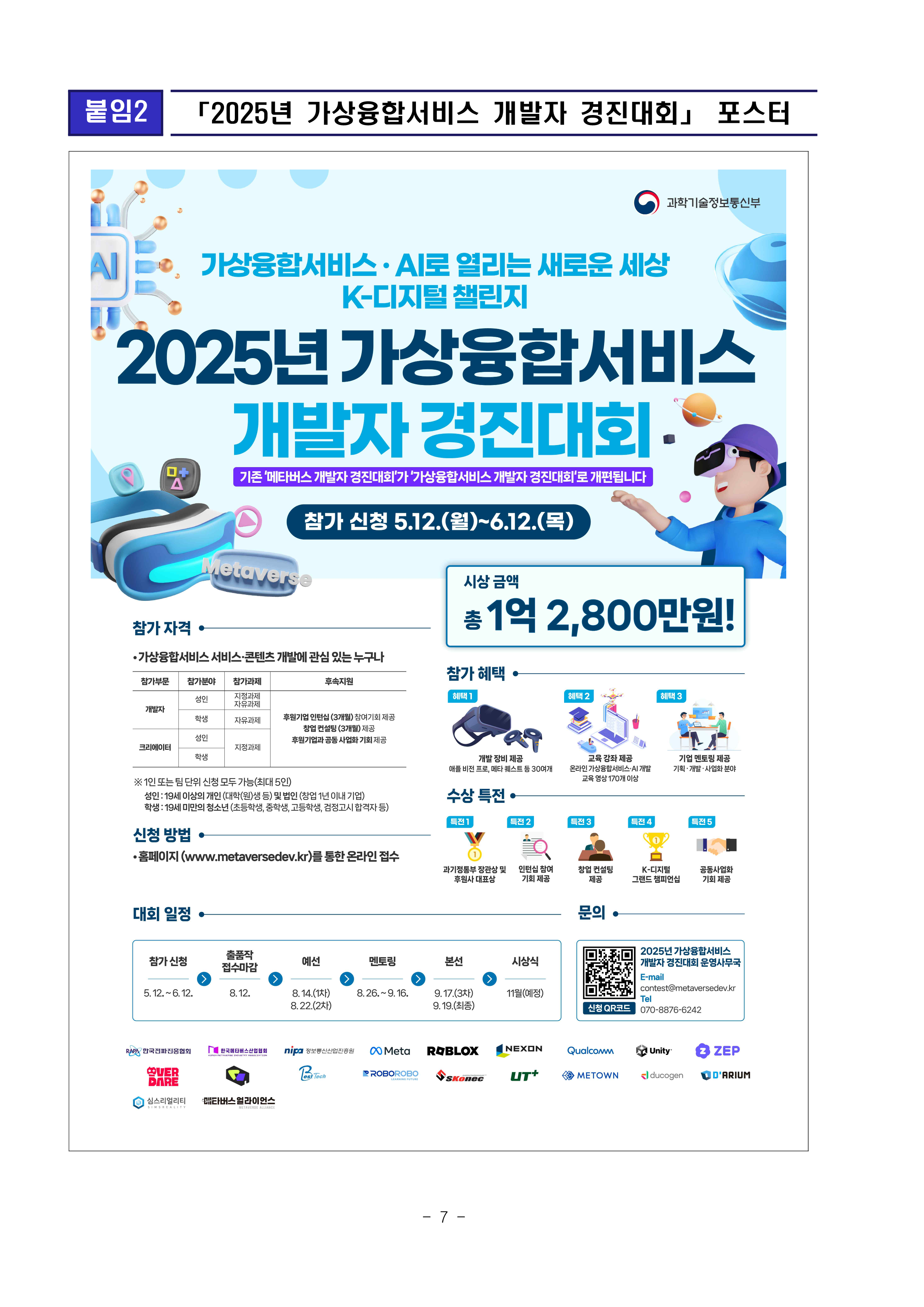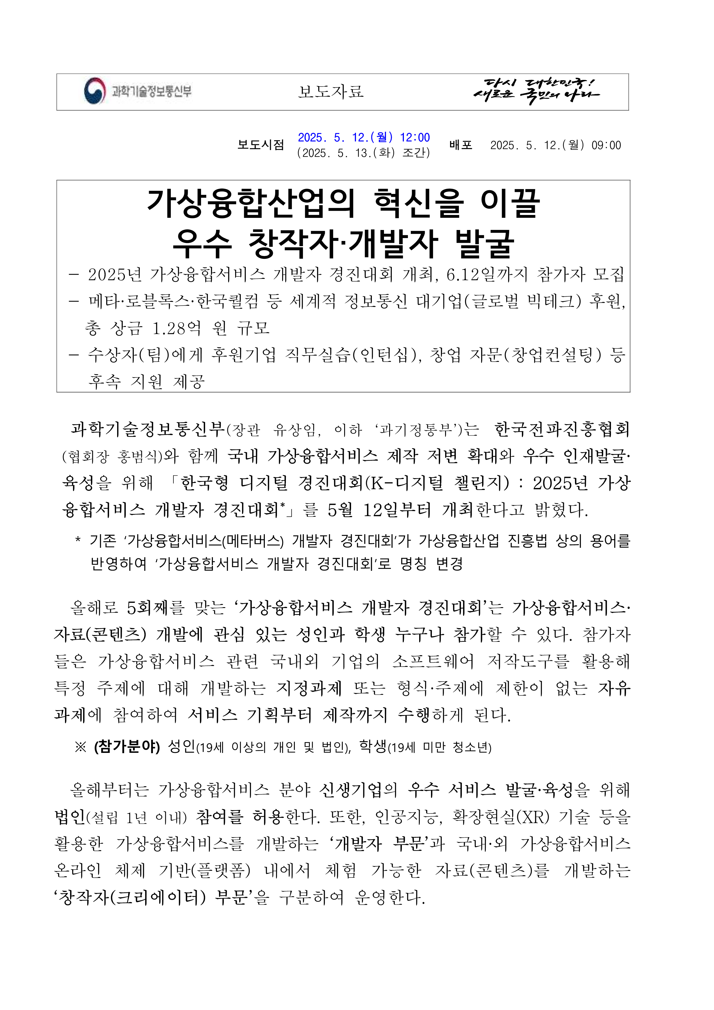 첨부문서: 250513 조간 (보도) 2025년 가상융합서비스 개발자 경진대회 개최(수정).pdf