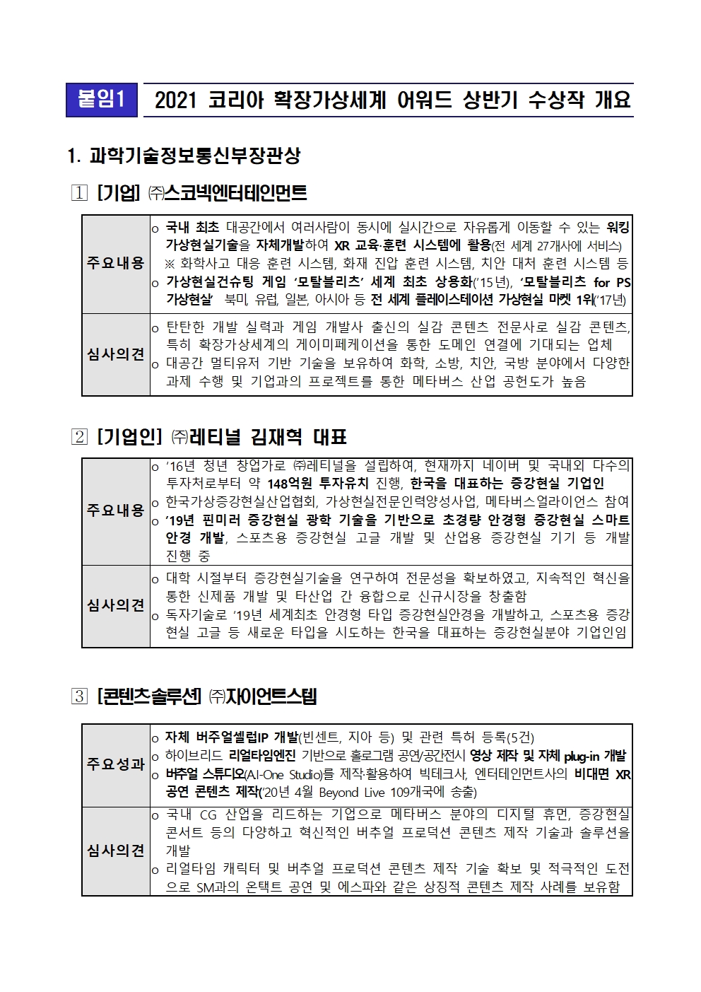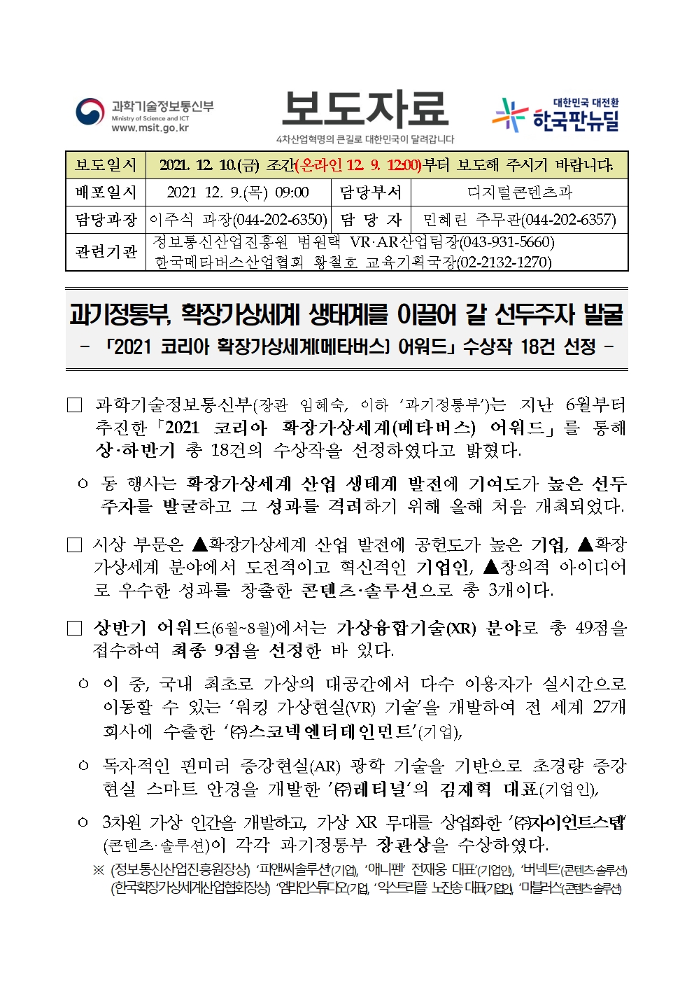 [과학기술정보통신부] 과기정통부, 확장가상세계(메타버스) 생태계를 이끌어 갈 선두주자 발굴